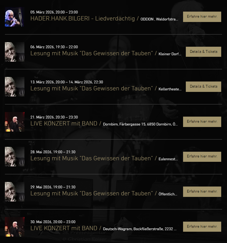 Ab Februar gibt es wieder zahlreiche Termine mit Reinhold Bilgeri. Der Singer/Songwriter, Filmemacher und Autor veranstaltet nicht nur Konzerte, sondern auch Lesungen mit seinem neuesten Buch »Das Gewissen der Tauben«. Bei seinen Lesungen singt der Musiker zwischendurch auch Songs aus dem Great American Songbook. Besuchen Sie eine der vielen Veranstaltungen und erleben Sie Reinhold Bilgeri live. Alle Termine finden Sie unter reinholdbilgeri.at/termine.