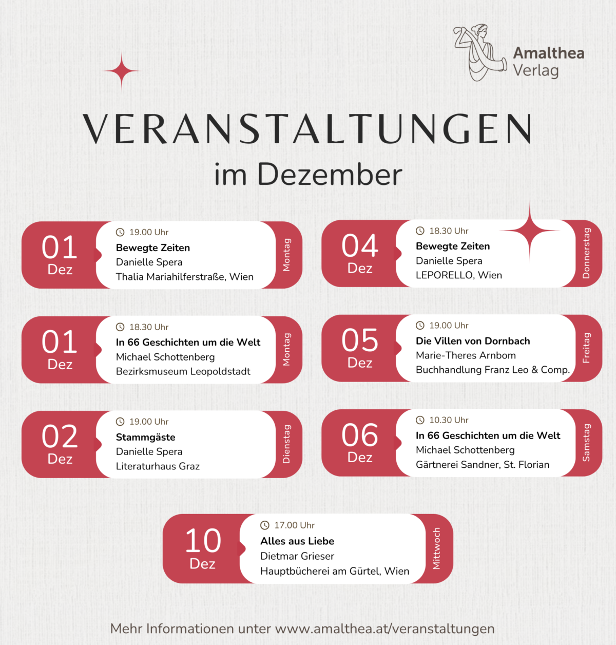 Im Dezember finden einige Buchpräsentationen und Lesungen unserer Autor:innen statt: Marie-Theres Arnbom präsentiert den neulich erschienenen Zuwachs ihrer Villen-Reihe »Die Villen von Dornbach«, Danielle Spera präsentiert ihr Buch »Bewegte Zeiten«, in dem sie niederösterreichische Geschichte mit Beiträgen etlicher Zeitzeug:innen und Schriftsteller:innen behandelt, Michael Schottenberg liest aus seinen reiselustigen Erzählungen »In 66 Geschichten um die Welt« und Dietmar Grieser aus seinem beliebten Buch über Wiener Liebschaften um 1900 »Alles aus Liebe«. Eine Übersicht über alle bevorstehenden Veranstaltungen finden Sie auf unserer Homepage.
